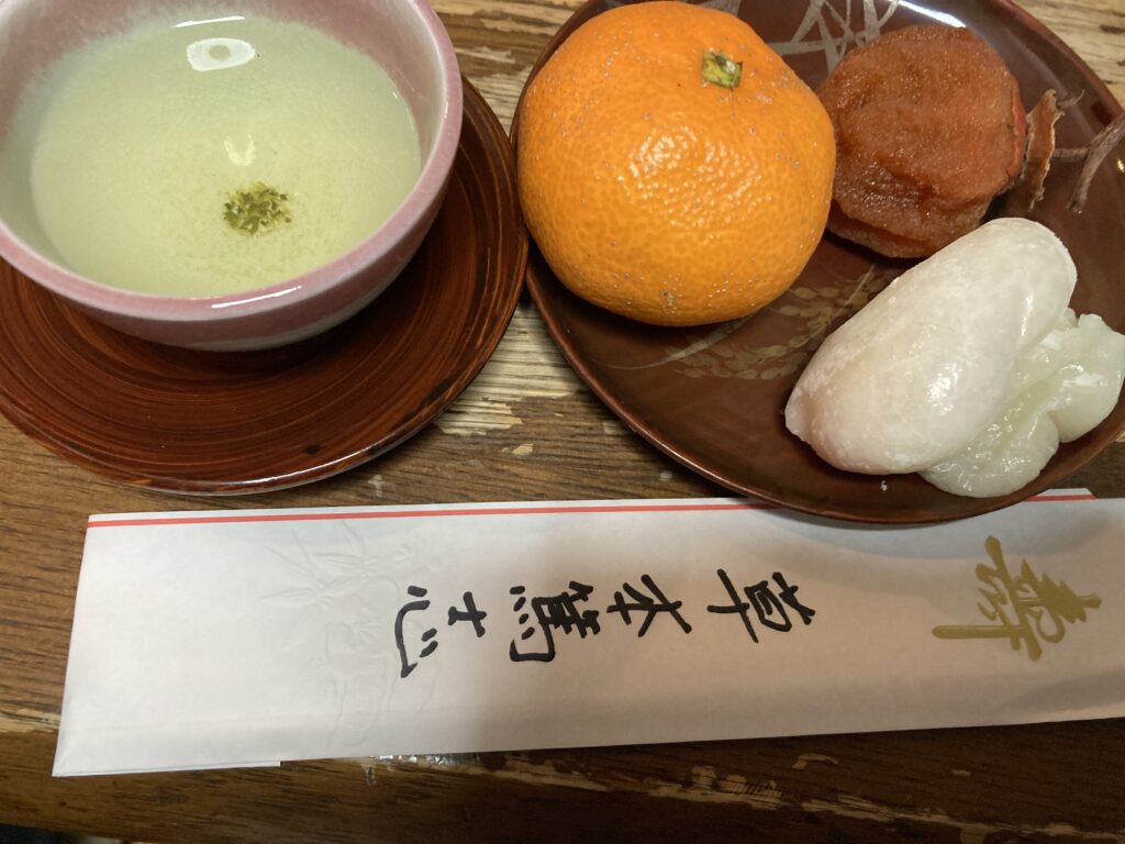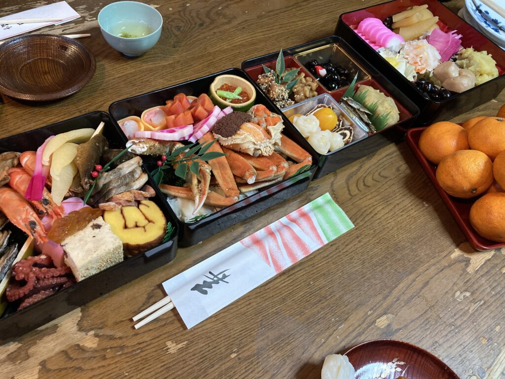 年始の挨拶は干柿とお餅とミカンで、その後おせちを頂いてます!