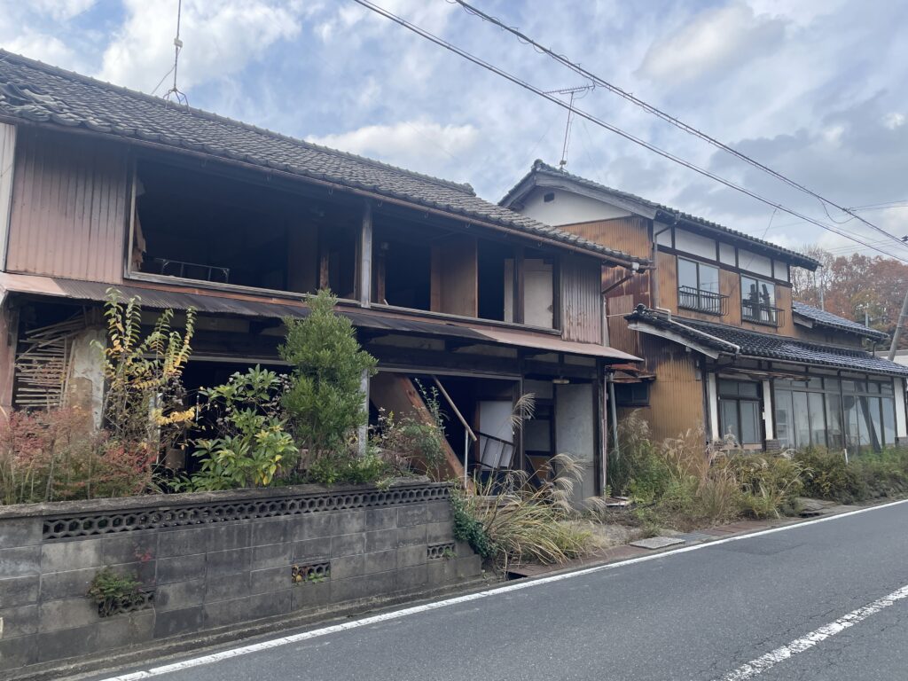 井尻興業様にお世話になり、峰山町丹波(駅前通り)建物2つ解体工事始まりました。