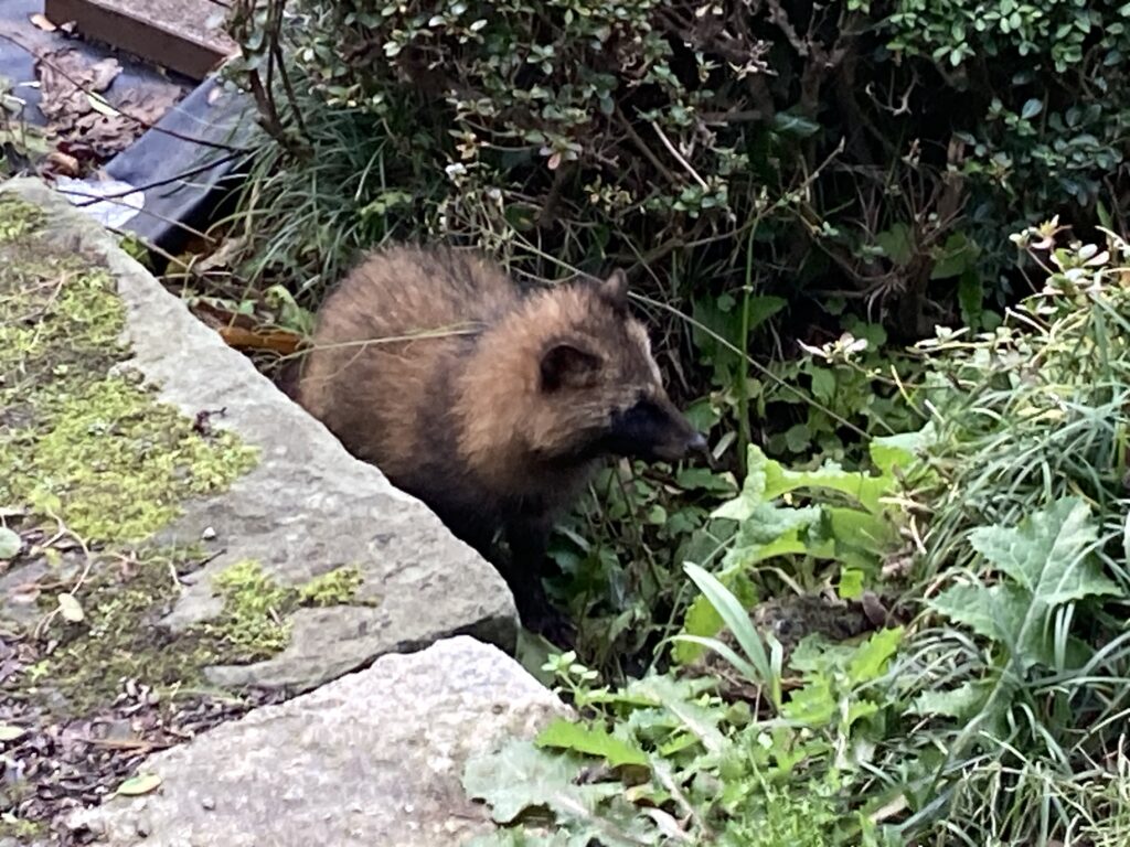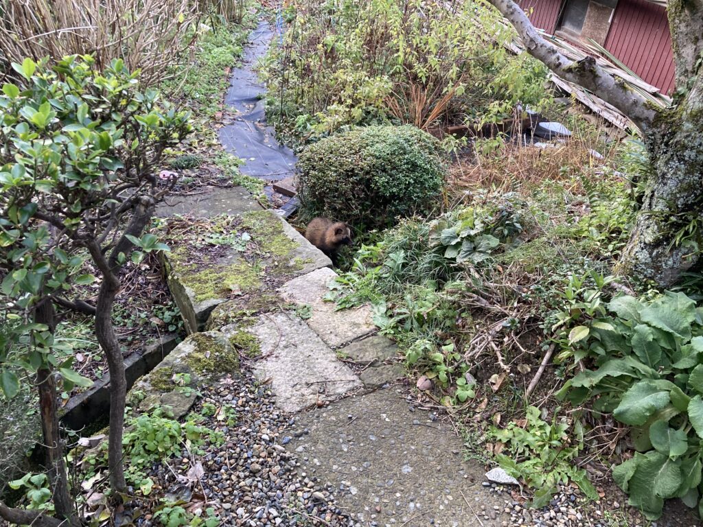 年末の大掃除中、自宅裏に微動だにしない子狸がチョッコリと。